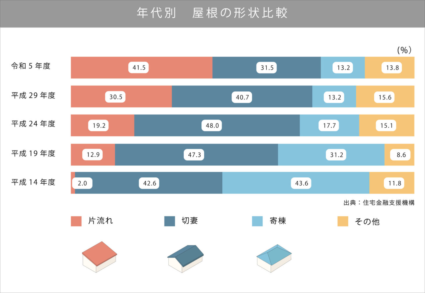 近年、片流れ屋根の人気はますます高まっています。住宅金融支援機構が発表した【フラット35】の設計検査を受けた新築一戸建て住宅(木造軸組工法)のデータによると、平成7年度時点では片流れ屋根の採用率は全体の約2割でした。しかし、令和5年度の調査では4割を超え、大幅な増加が確認されています。